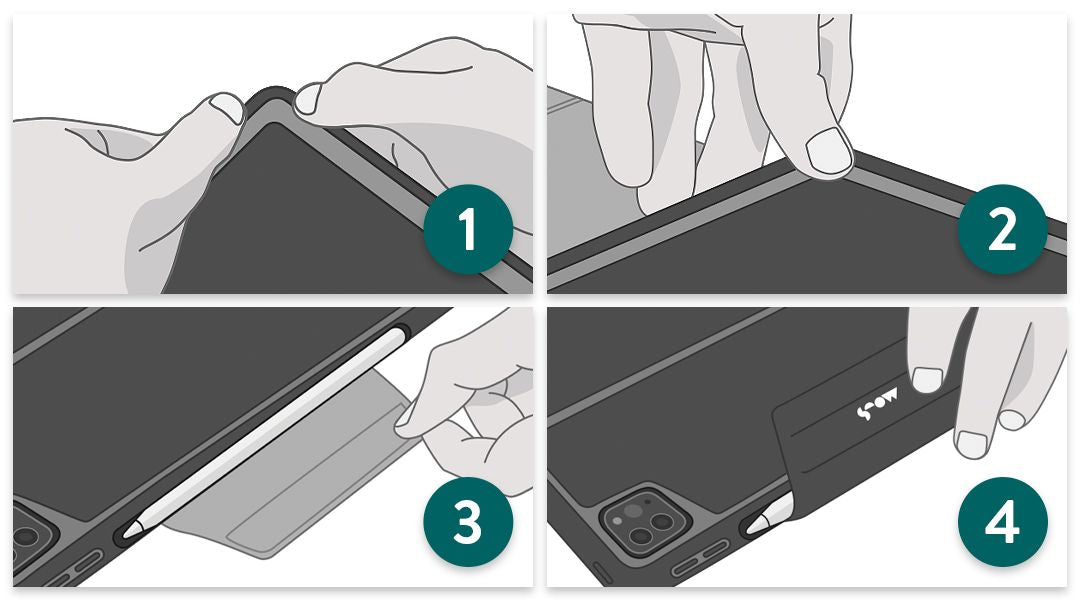 - If you have an Apple Pencil, open the side latch and slide the pencil into the loop
