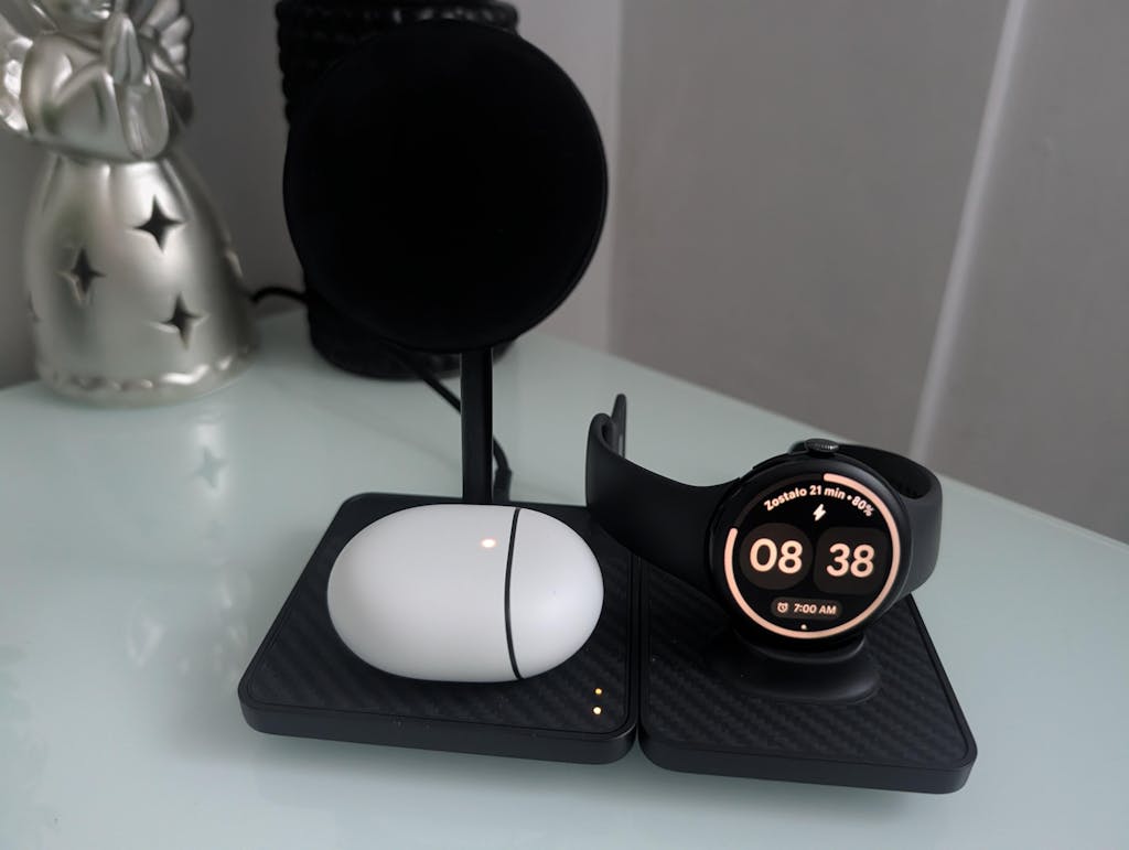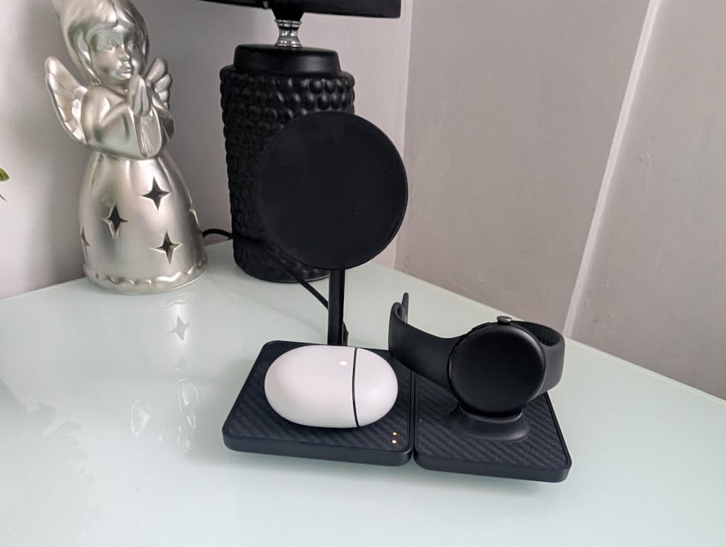 • A secondary Qi coil on the base allows you to power a second device like earbuds at the same time.