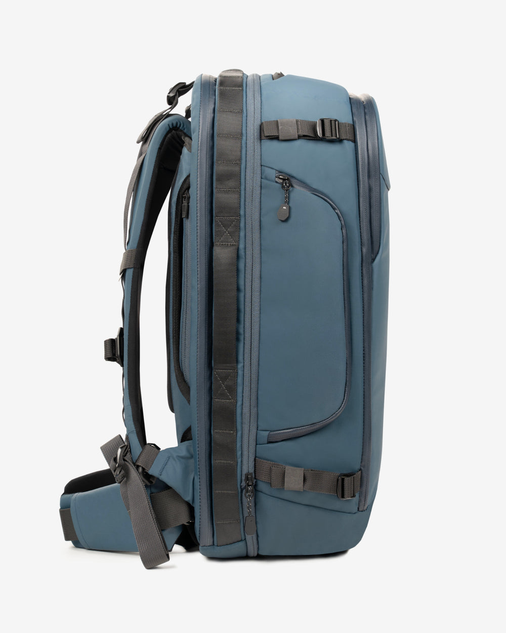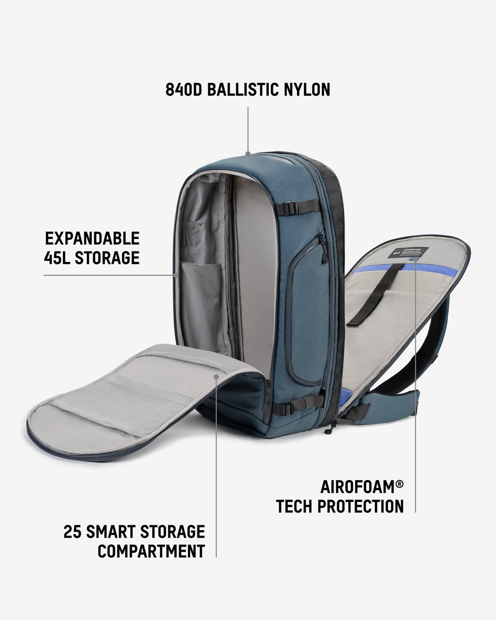 Expands from 40L to 45L and opens flat like a suitcase for easy, structured packing—minus the bulk and weight.