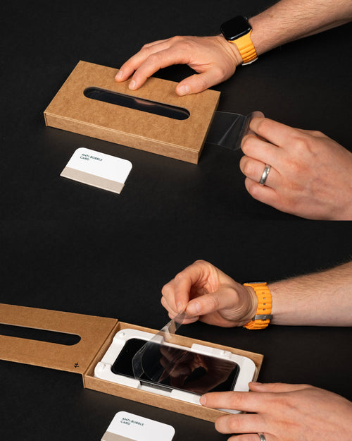 Yes. Each protector comes with a custom applicator tray, pull-tab alignment film and guide pins for total accuracy. Place your phone in the tray, close the lid and pull the tab in one smooth motion – the adhesive spreads evenly for a clean bond. Run your finger along the centre channel to secure the seal and use the included anti-bubble card to remove any bubbles. It’s designed to minimise dust interference for a crystal-clear finish. When replacing, the protector lifts off cleanly without residue, leaving your display pristine.