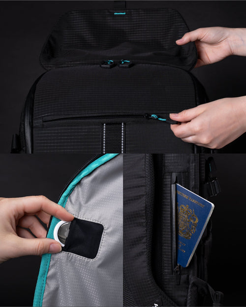 • 18 purpose-built pockets, including stretch mesh, quick-access, hidden AirTag and water bottle holder.