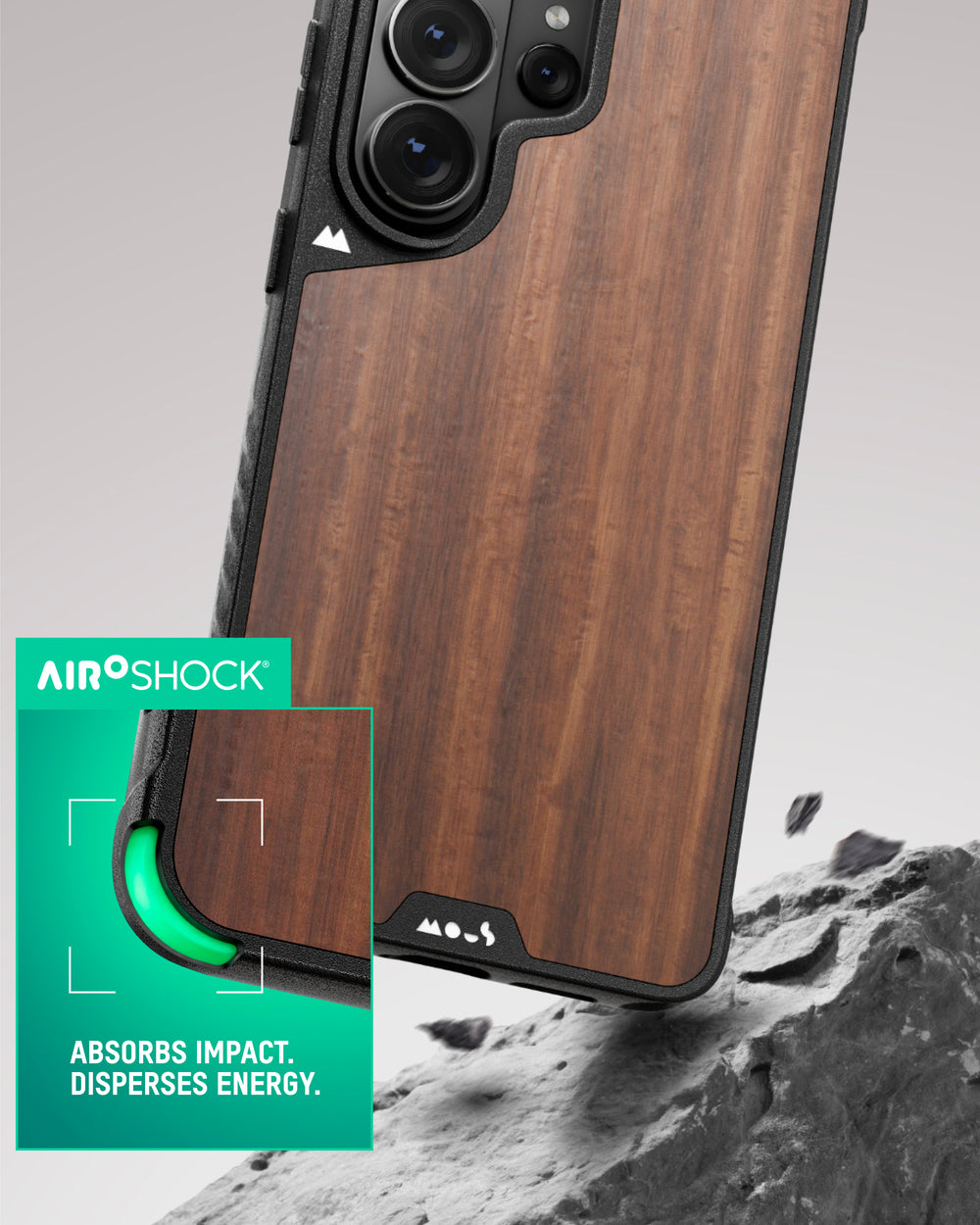 AiroShock® impact materials and a reinforced camera bump combine with a rigid shell to deliver Mous-grade impact defence.