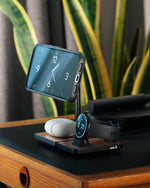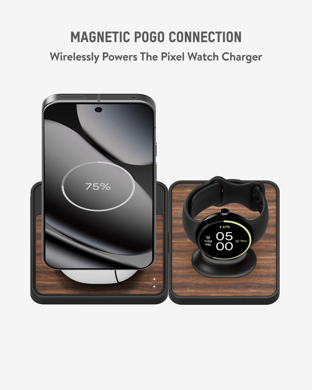 Yes. The Pixel Watch Charger magnetically connects to the stand’s pogo pins, creating a secure modular link that transfers power directly through magnetic contact. This allows both chargers to draw power from a single cable while the base Qi coil powers a third device such as earbuds.